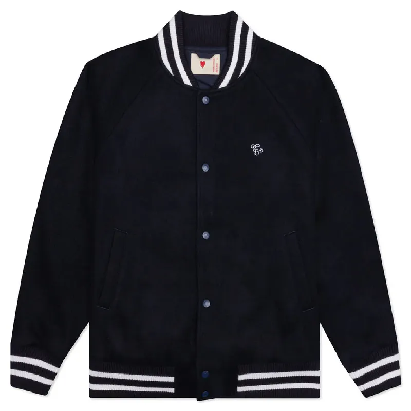 Navy Emotionally Unavailable Melting Heart Varsity Jacket
