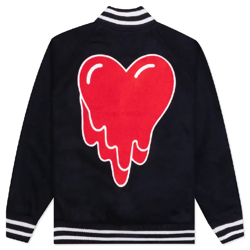 Add something special to your wardrobe with this Navy Emotionally Unavailable Melting Heart Varsity Jacket. The deep navy color is accented by a unique melting heart graphic, making a standout statement. Featuring a classic varsity design with ribbed trims and a full-zip closure, this jacket offers a snug, stylish fit.