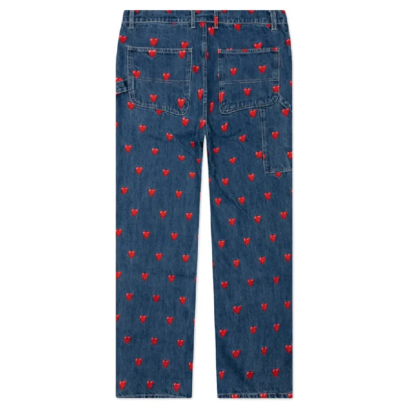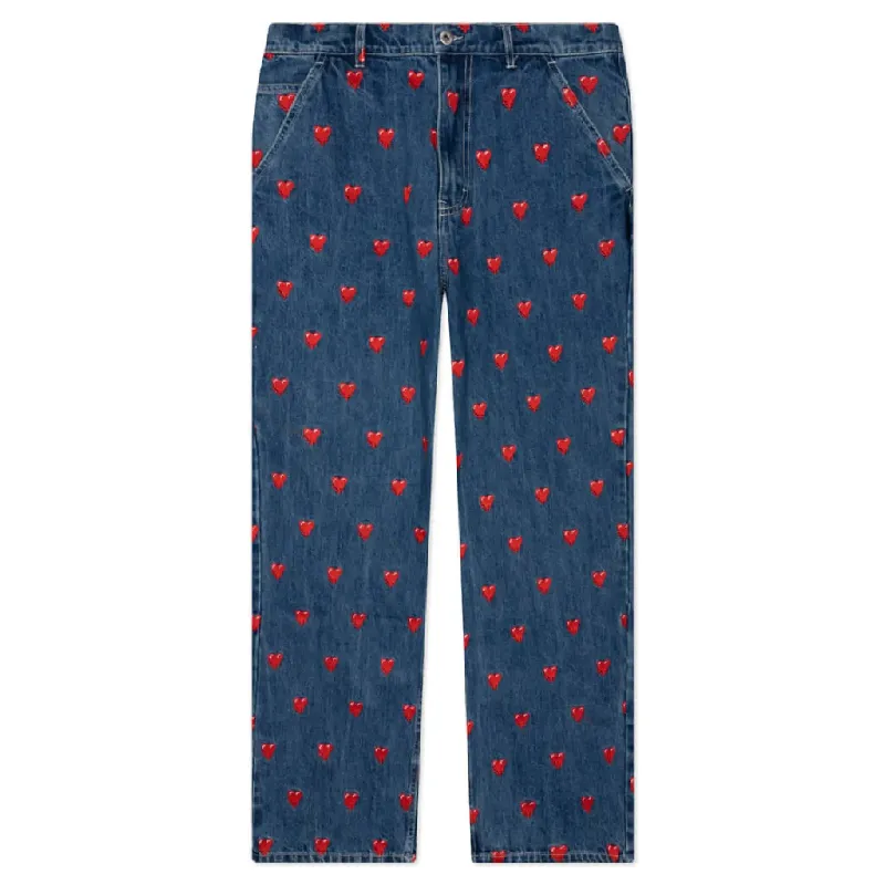 The Washed Blue Emotionally Unavailable Logo Pattern Denim Pants combine classic denim with a bold twist. They are made from high-quality denim, offering a soft, relaxed fit that moves with you. These pants are designed for those who want to stand out while staying comfortable.
