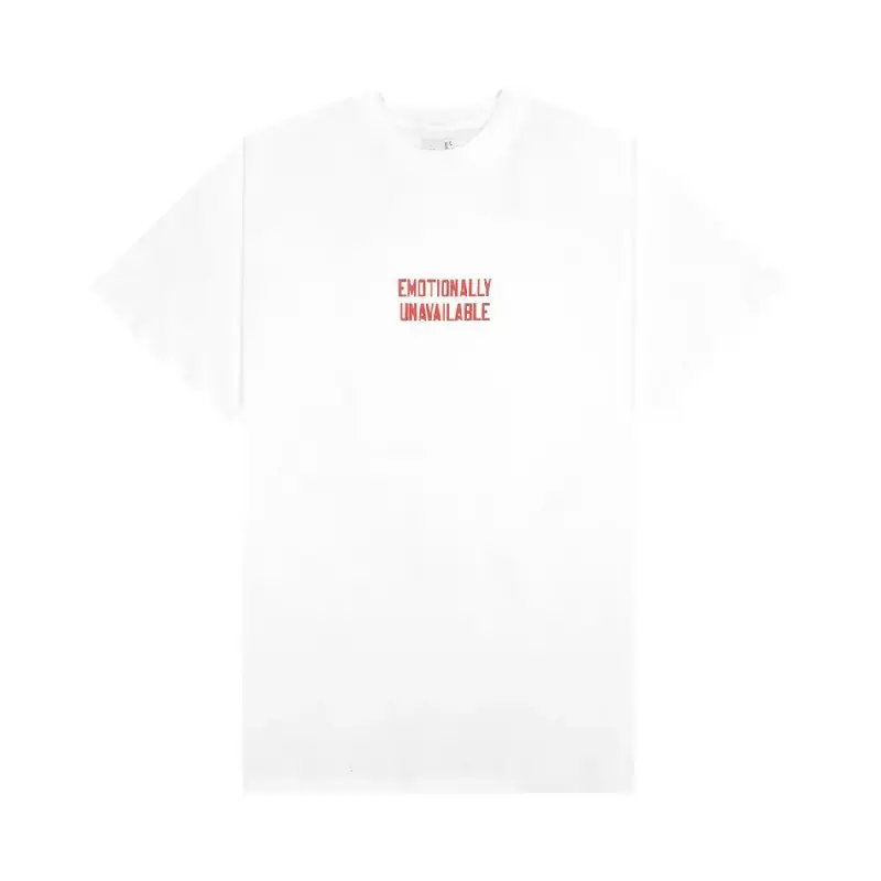 The White Emotionally Unavailable Logo Type Tee is simple, bold, and comfortable. This t-shirt is crafted with high-quality cotton, feeling great all day long. The clean white color makes it easy to match anything in your wardrobe. The large “Emotionally Unavailable” logo on the chest adds a standout touch, giving it a unique and stylish vibe.
