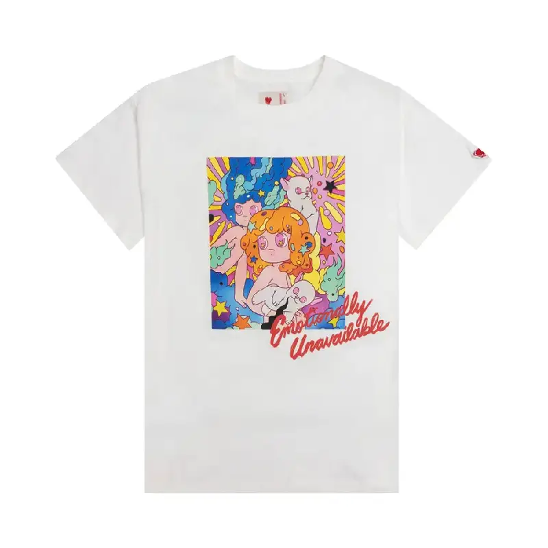 The White Emotionally Unavailable x So Youn Lee Stardust Tee combines art and fashion in bold pieces. Created in collaboration with artist So Youn Lee, this t-shirt is a perfect statement piece. It is made from soft cotton fabric to keep you comfortable. The Stardust graphic on the front adds a unique, artistic touch that stands out.